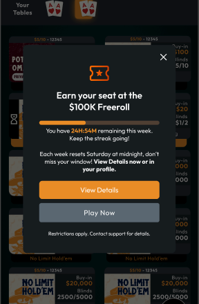 Play 25+ qualifying hours each week to unlock your entry into the $100K Freeroll.