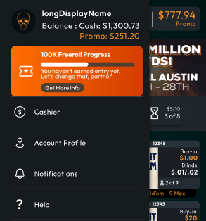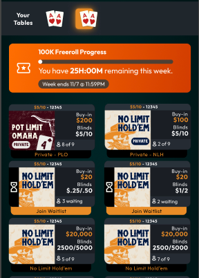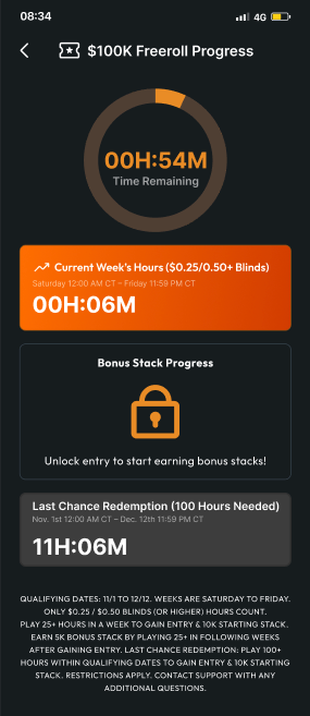 Start each week with 25 hours to play. Watch it tick down as you play hands at $0.25/$0.50 blinds or higher — your progress updates as you go! - Real-Time Progress Updates: